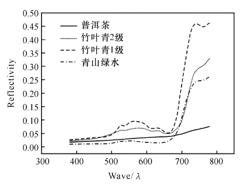 The figure above shows the reflectance spectral curves for four types of tea: Zhu Ye Qing Grade 1, Zhu Ye Qing Grade 2, Qing Shan Lv Shui, and Pu-erh. The spectral analysis is as follows: